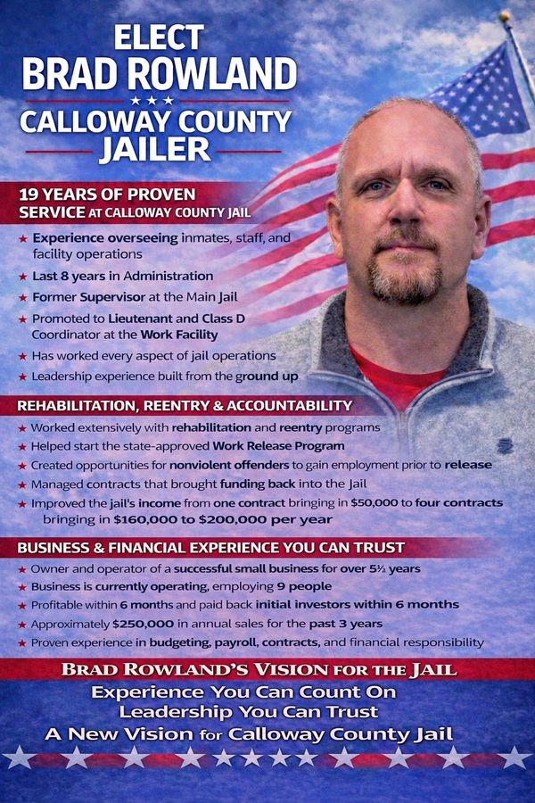 Brad Rowland has a plan to lead the Calloway County Jail with integrity and experience. We need your help to make it happen.